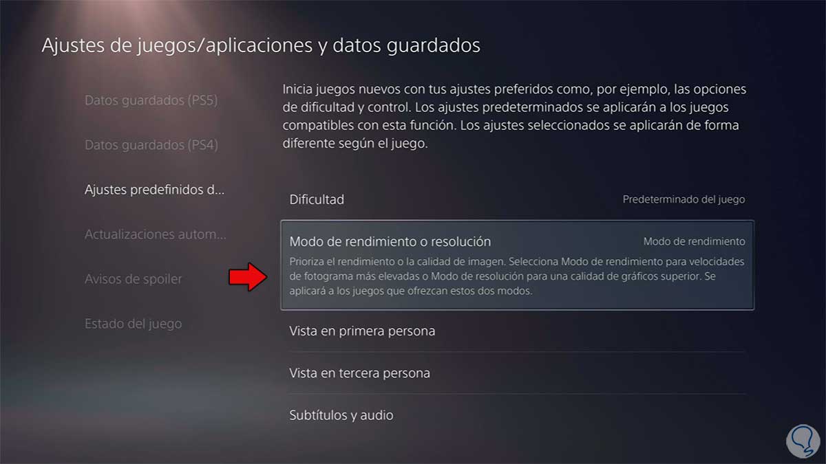 Entramos en "Modo de rendimiento o resolución" y elegimos "Modo rendimiento". Con esta opción el juego elegirá configuración de fotogramas más alta mejorando el rendimiento.