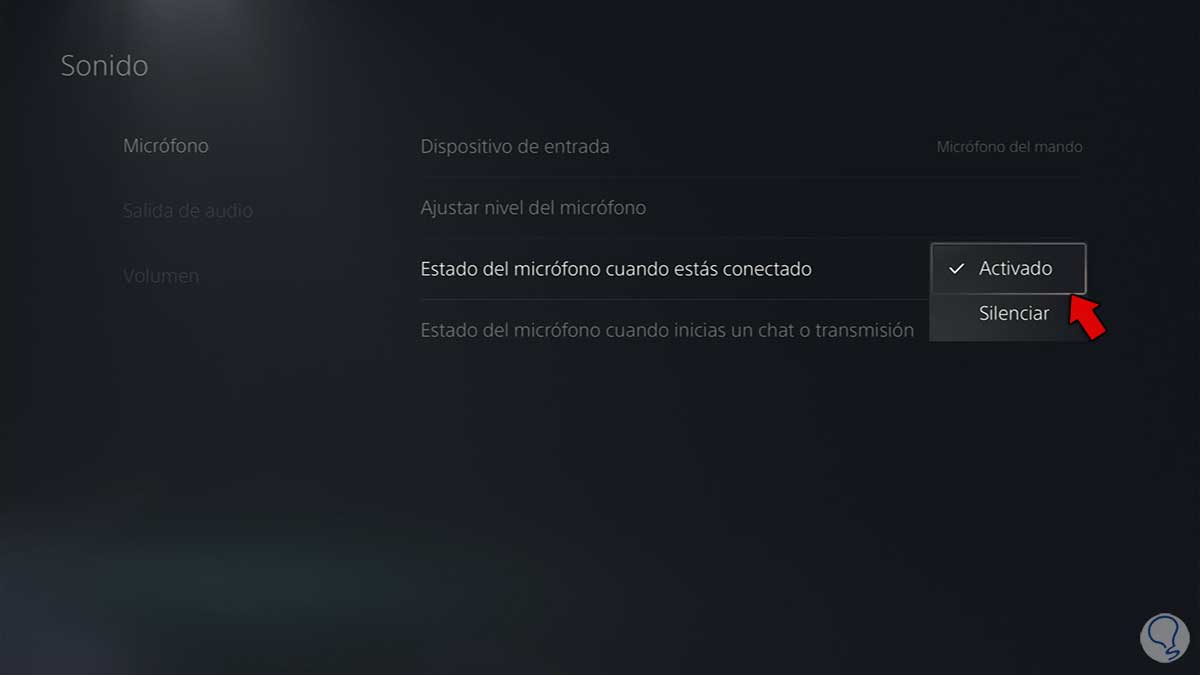 Lo siguiente que debes hacer es pulsar en el menú desplegable la opción de "Silenciar" para activar o desactivar el micrófono en PS5.