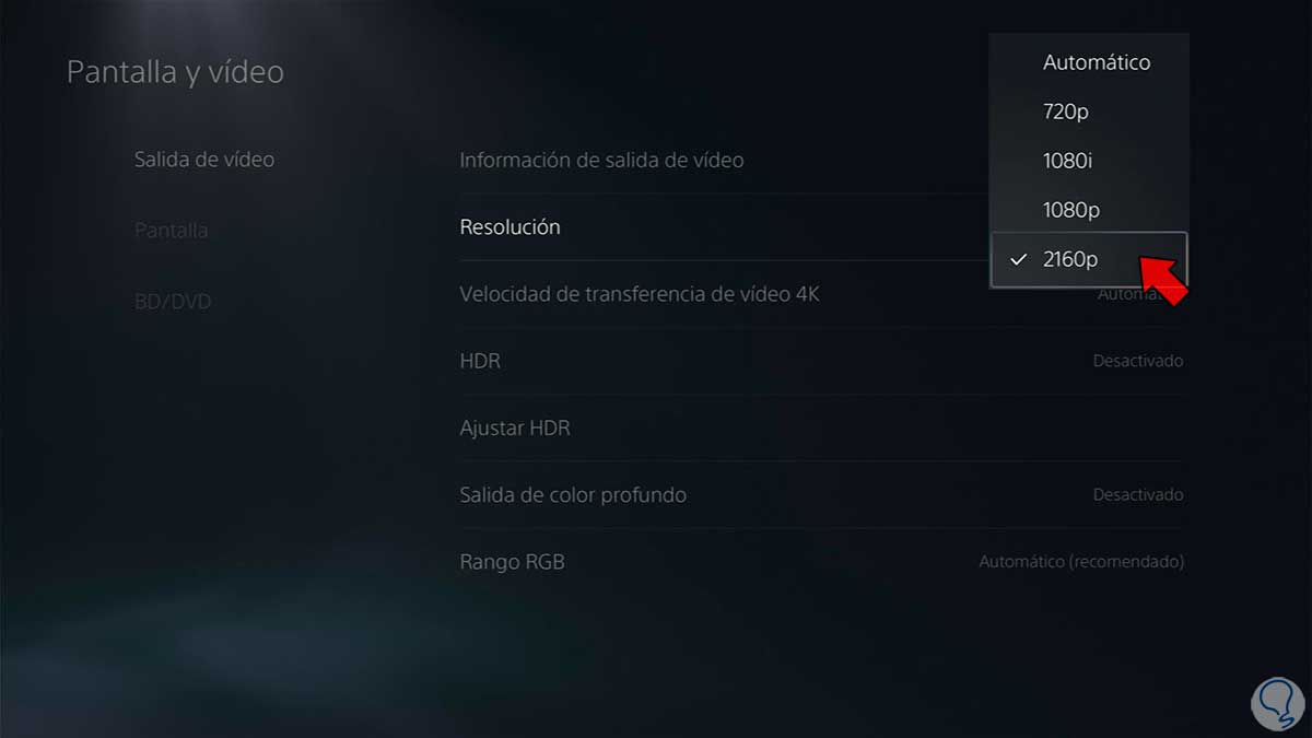Dentro de "Salida de vídeo" pulsamos en "Resolución". Comprueba que tienes el "Automático" o la máxima que quieres o tienes disponible