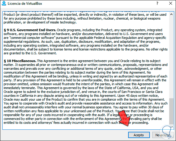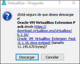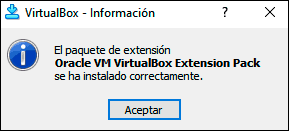 Damos clic en Acepto para completar la actualización de las VirtualBox Extension Pack: