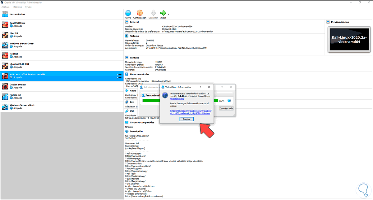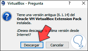 Automáticamente veremos que es posible actualizar las VirtualBox Extension Pack: