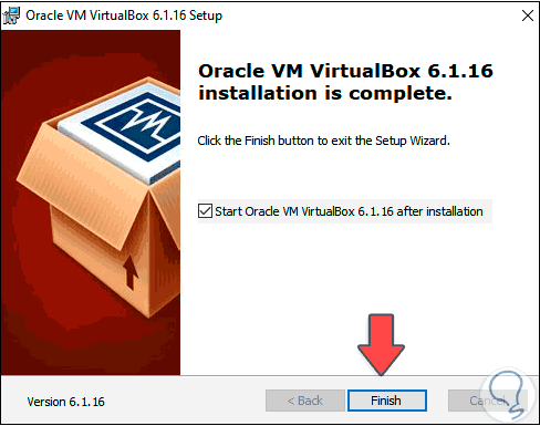 Al finalizar el proceso veremos lo siguiente. Clic en Finish para cerrar el asistente y ejecutamos VirtualBox.