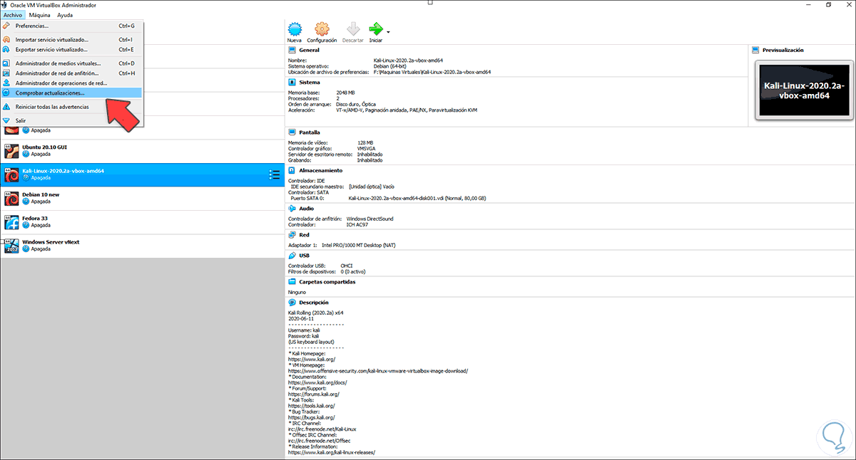 Lo primero es que abrimos VirtualBox y vamos al menú "Archivo - Comprobar actualizaciones":