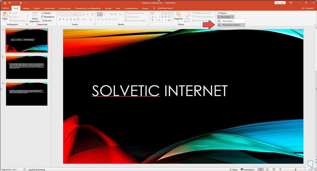 Para usar este método, abrimos PowerPoint y vamos al menú "Inicio - Reemplazar - Reemplazar fuentes":