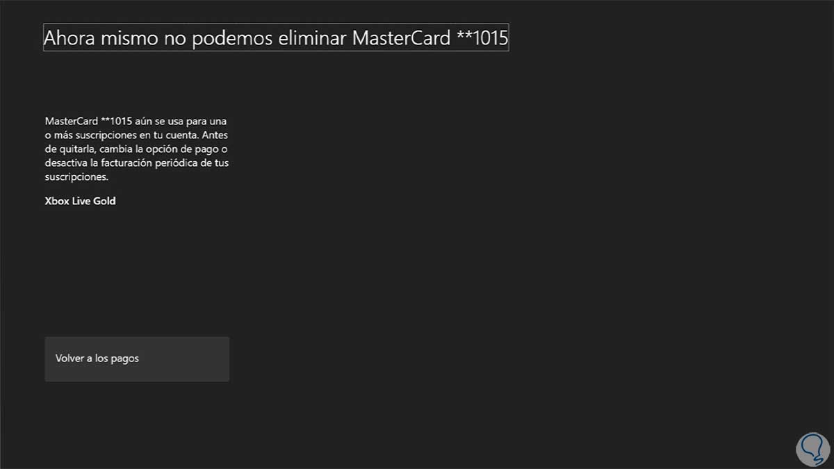 Dentro podremos eliminar la tarjeta. Ten en cuenta que, si tienes una suscripción activa como Xbox Gold, no podrás eliminar la tarjeta hasta que canceles la suscripción.