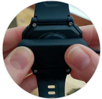 Ahora encajaremos bien nuestra base de carga y sus contactos con los del Amazfit Neo que hemos visto asegurándonos de que el reloj está bien ajustado. Quedará encajado y hará una especie de clic al ponerlo.