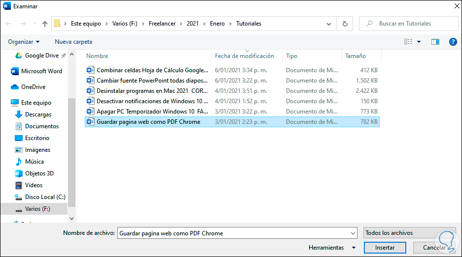 En la ventana desplegada vamos a seleccionar el archivo deseado y lo insertamos: