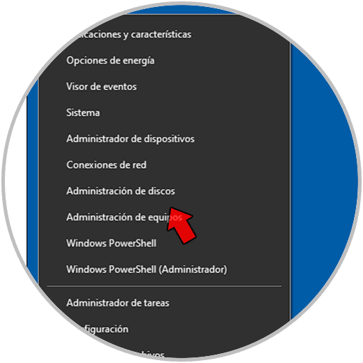 Damos clic en Cerrar para finalizar el proceso, ahora vamos a ocultarla en Windows 10, para ello damos clic derecho en el botón de Windows y selecciona "Administración de discos":