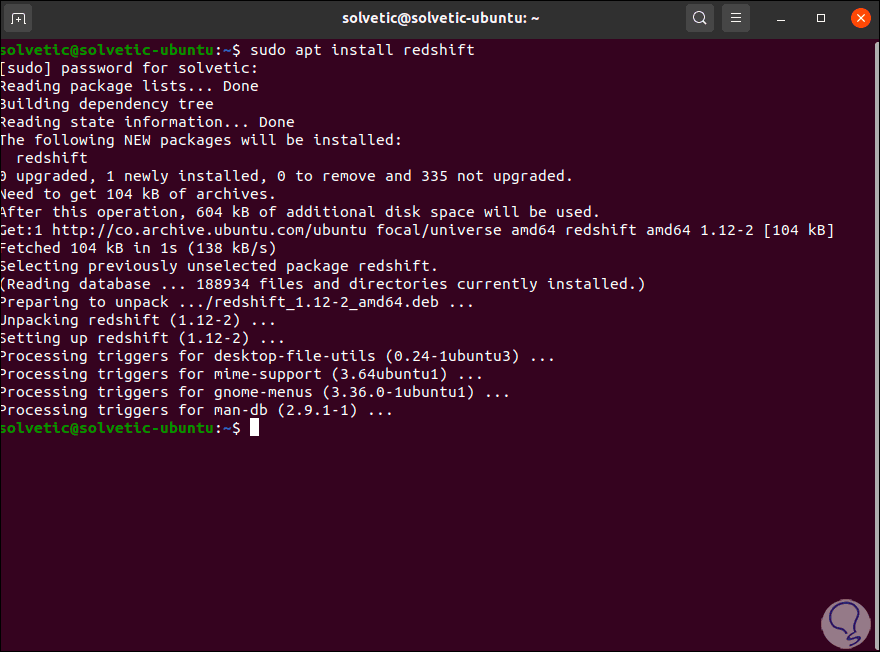 En nuestro ejemplo ejecutamos "sudo apt install RedShift":