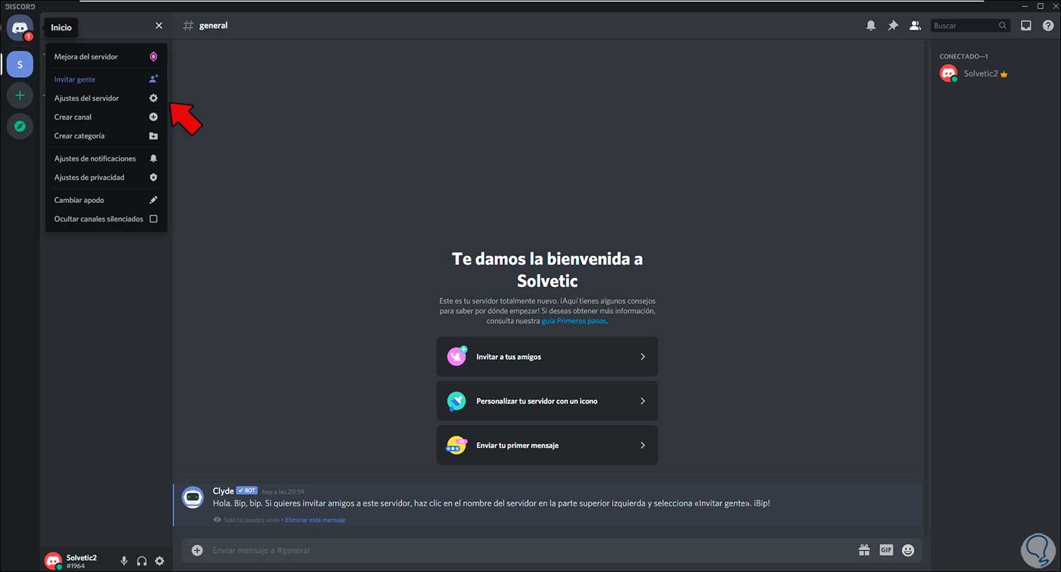 Abrimos Discord, pulsamos en el icono de configuración del servidor y seleccionamos "Ajustes del servidor":