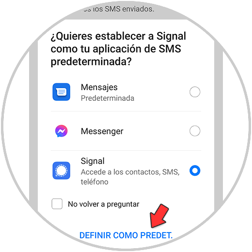 Finalmente pulsa sobre Signal para establecer esta app como la aplicación de SMS predeterminada en tu teléfono.