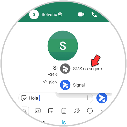 Ahora mantén presionado el icono de enviar. Verás que aparecen dos opciones. En este caso selecciona "SMS no seguro"