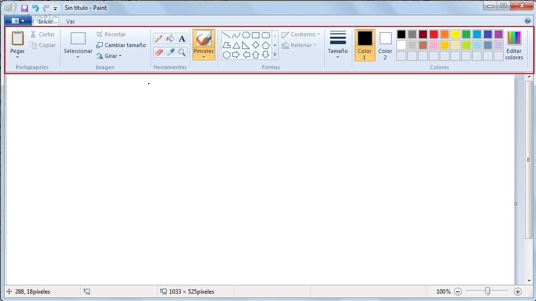 Para usar Paint, abre el Menú de Inicio, selecciona “Todos los Programas” -> “Accesorios” -> Paint. Una vez abierto Paint, tendrás un “lienzo” blanco y una serie de herramientas en la parte superior del programa.