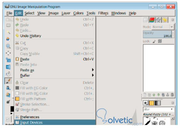 1- Abrir Gimp y vamos a dirigirnos a la opción Editar del menú superior y seleccionaremos la opción dispositivos de entrada, esto lo podemos ver en la siguiente imagen: