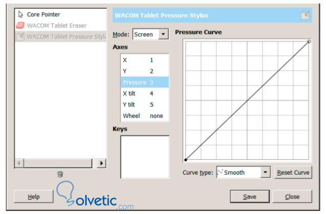 3- Ahora seleccionamos nuestra tabla y acto seguido en el desplegable de modo, seleccionamos la opción pantalla o screen, de esta forma le indicamos a Gimp que lo que capture en la tabla lo debe tomar como si ocurriera en la pantalla, esto es lo que nos va a permitir realizar los diferentes trazos.
