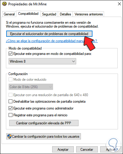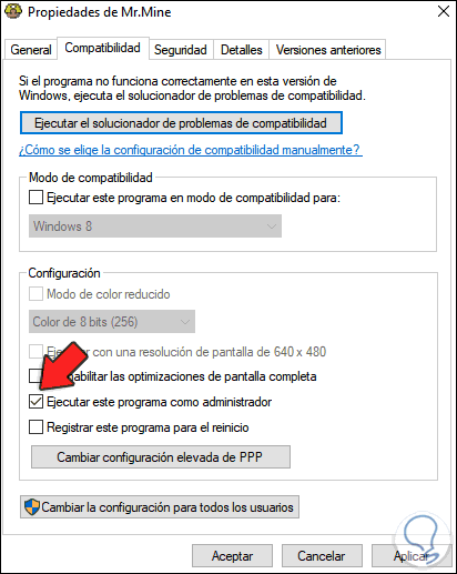 En la siguiente ventana vamos a la pestaña “Compatibilidad” y activamos la casilla “Ejecutar este programa como administrador”:
