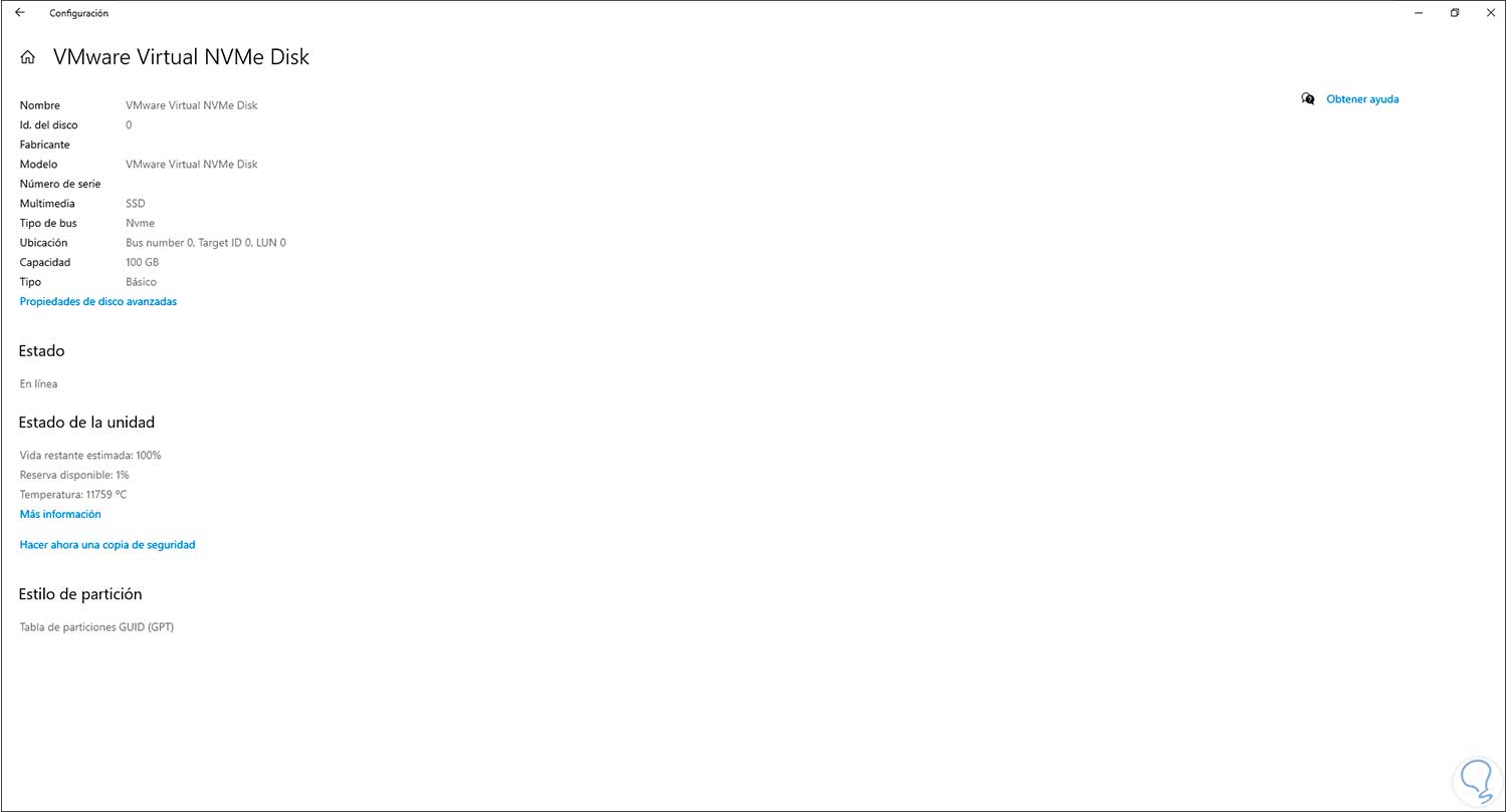 Clic en el disco SSD y luego clic en "Propiedades" y en la parte inferior verás la temperatura y más detalles del disco SSD en la sección “Estado de la unidad”: