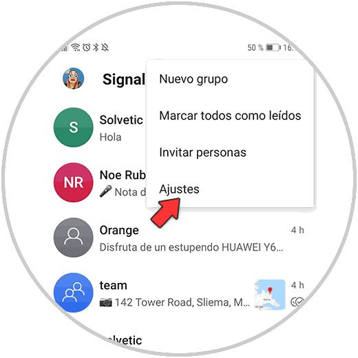 Lo primero que debes hacer es entrar en la app de Signal y pulsar sobre el menú de la esquina superior derecha.