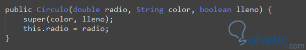 Aquí vemos el constructor de la clase circulo, vemos que recibe algunos argumentos, si no utilizamos la palabra super dentro del mismo, deberíamos hacer las asignaciones correspondientes de sus atributos, sin embargo esto es innecesario ya que la clase padre o superclase lo ha hecho, por ello al invocar con la palabra super y pasarle los argumentos necesarios invocaremos a su constructor.