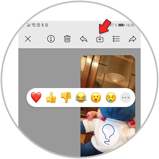 Lo siguiente que debes hacer es mantener presionada esta foto y verás que en la parte superior se despliega un menú. Debes pulsar sobre el símbolo de guardar.