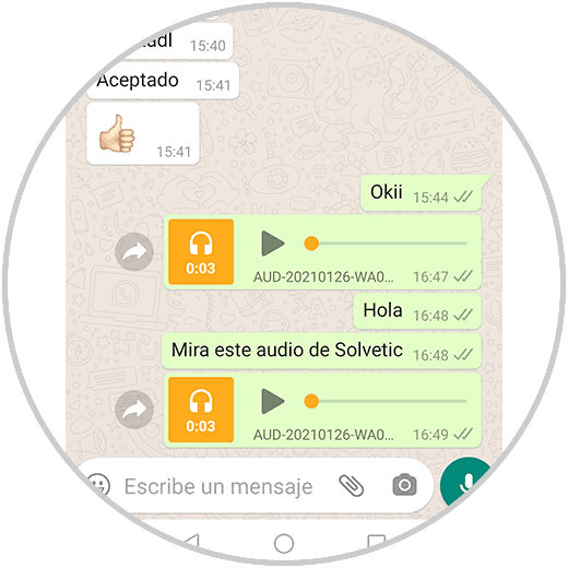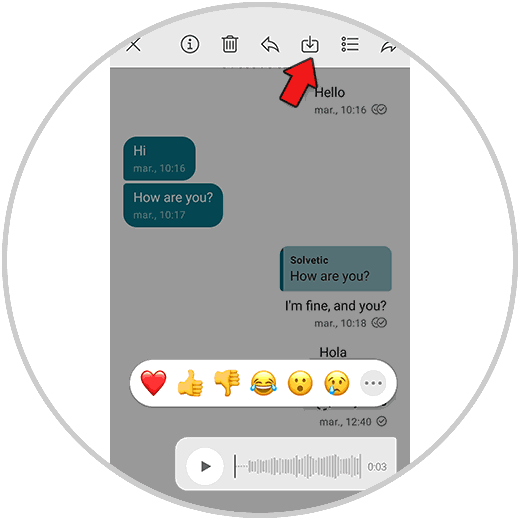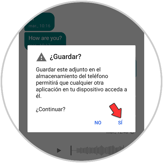 Ahora debes mantener el audio pulsado y verás que aparecen diferentes opciones. Pulsa el icono de guardar.