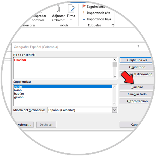 Ahora, si la palabra esta incorrecta al dar clic en "Enviar" automáticamente se desplegará la sugerencia de ortografía de Outlook para esa palabra. Seleccionamos la palabra que es y damos clic en Cambiar.