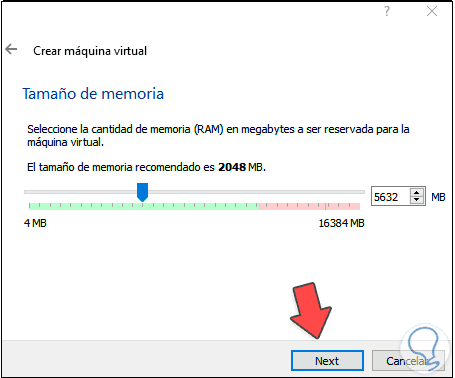 Damos clic en Next y en la siguiente ventana definimos la memoria RAM a usar en la maquina: