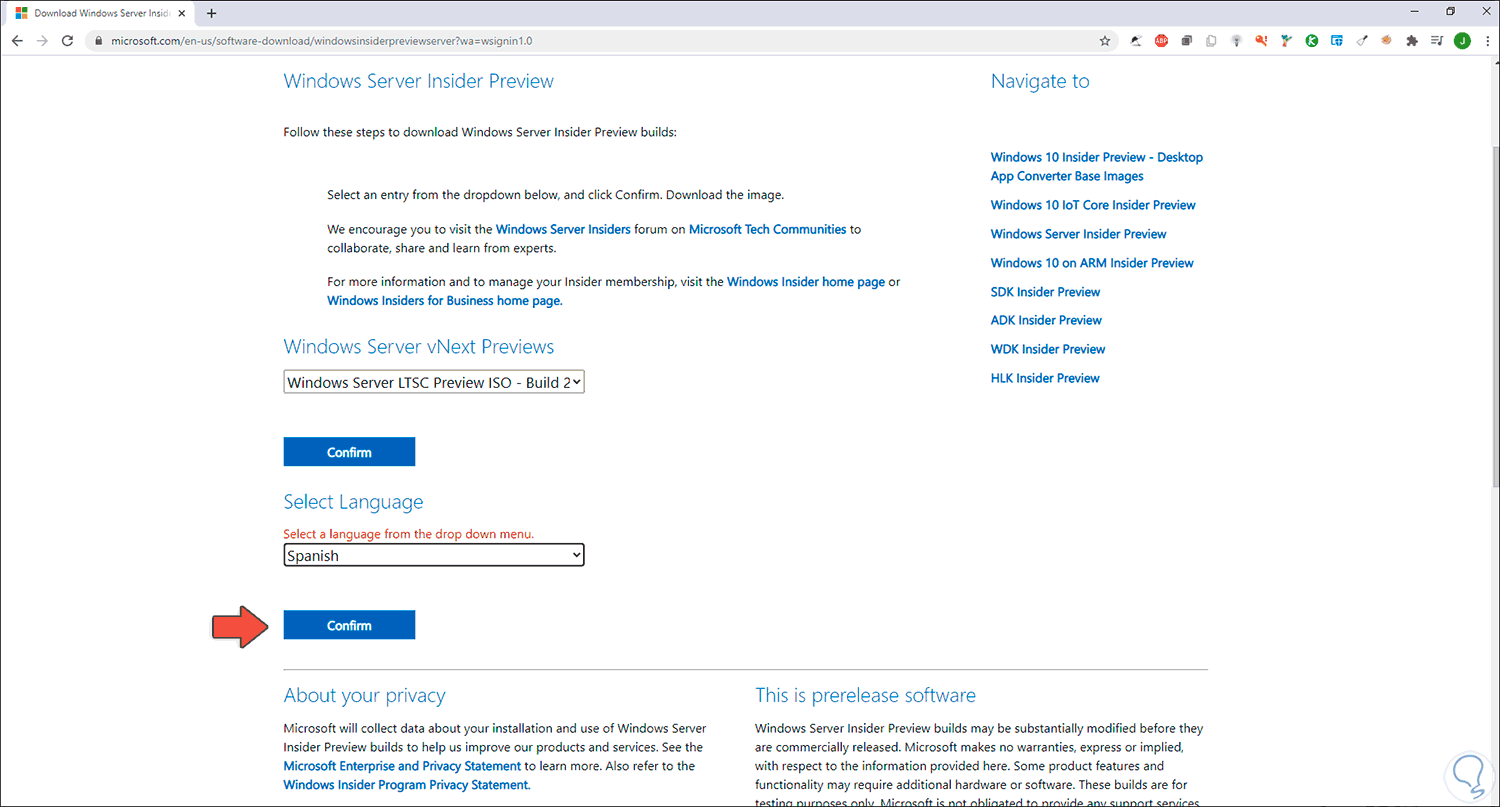Allí debemos seleccionar el tipo de imagen a descargar, en este caso Windows Server LTSC Preview y luego seleccionar alguno de los 18 idiomas disponibles:
