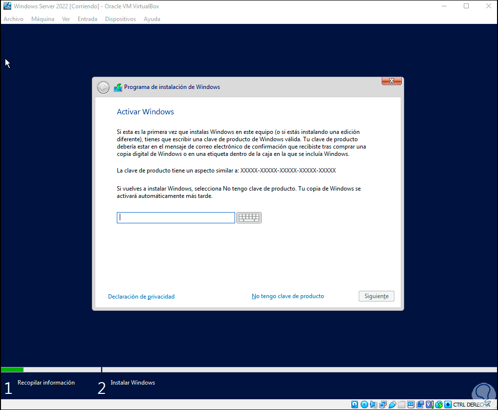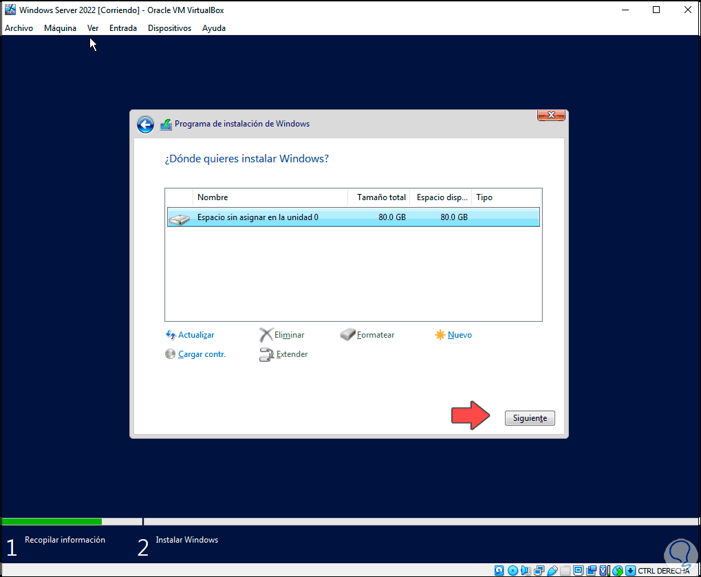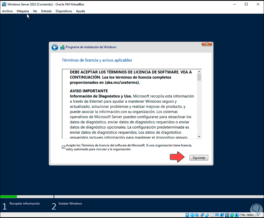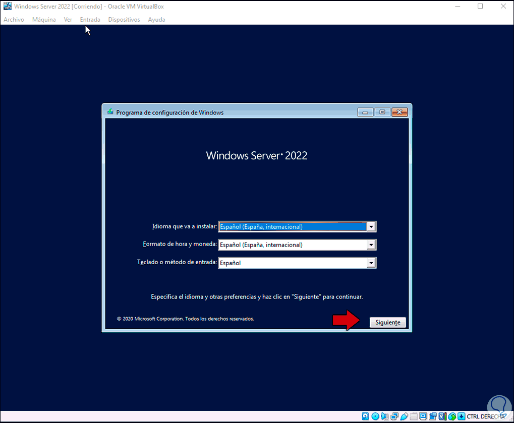 Clic en Siguiente para iniciar la instalación de Windows Server 2022:
