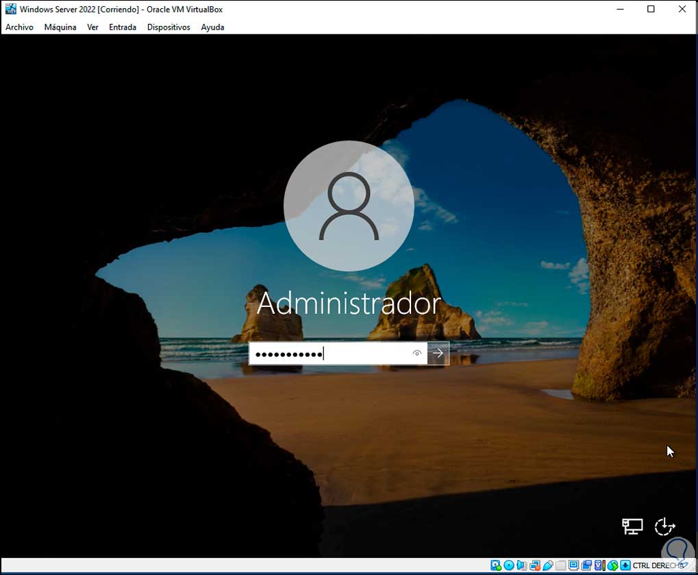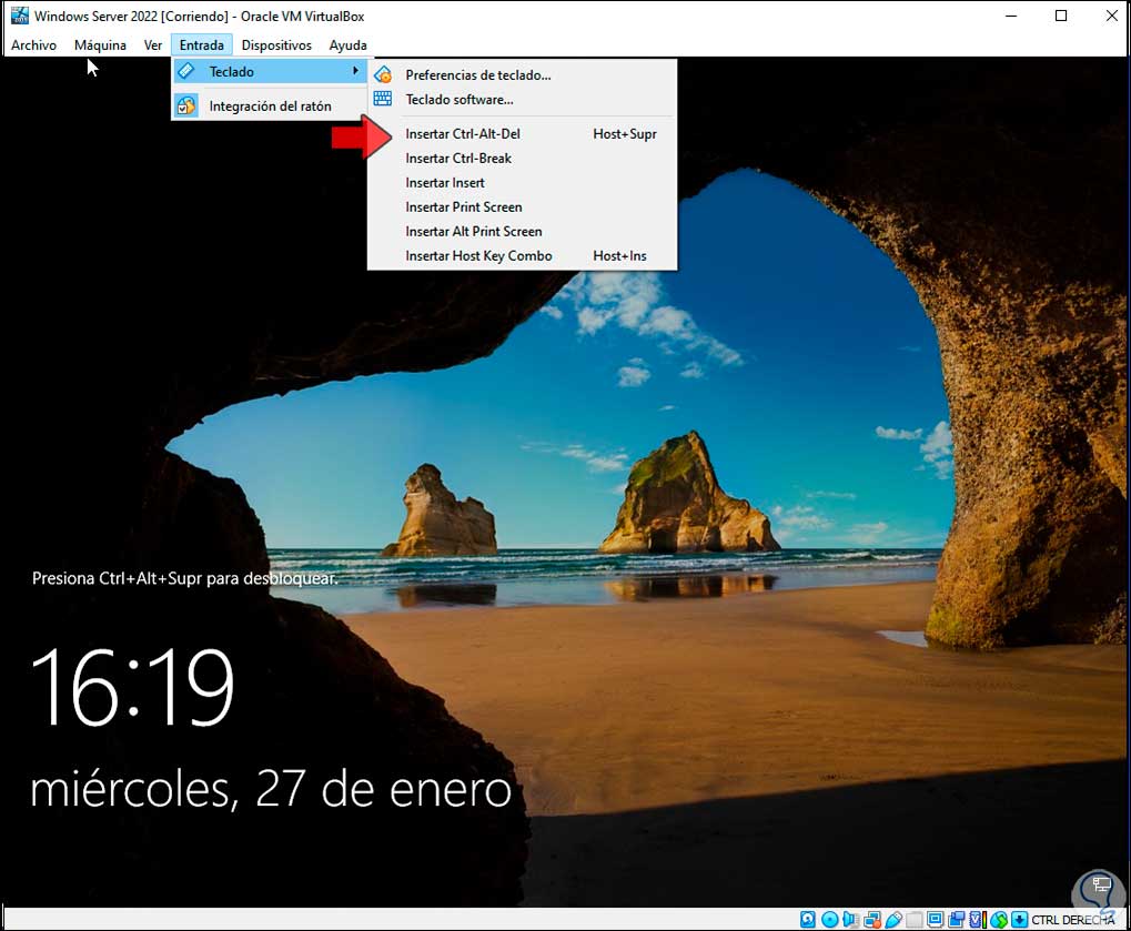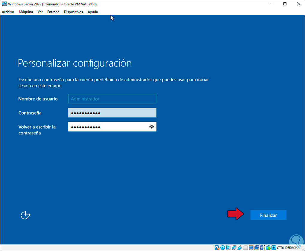Clic en Finalizar y luego para acceder al servidor vamos al menú "Entrada - Teclado - Insertar Ctrl + Alt + Del":