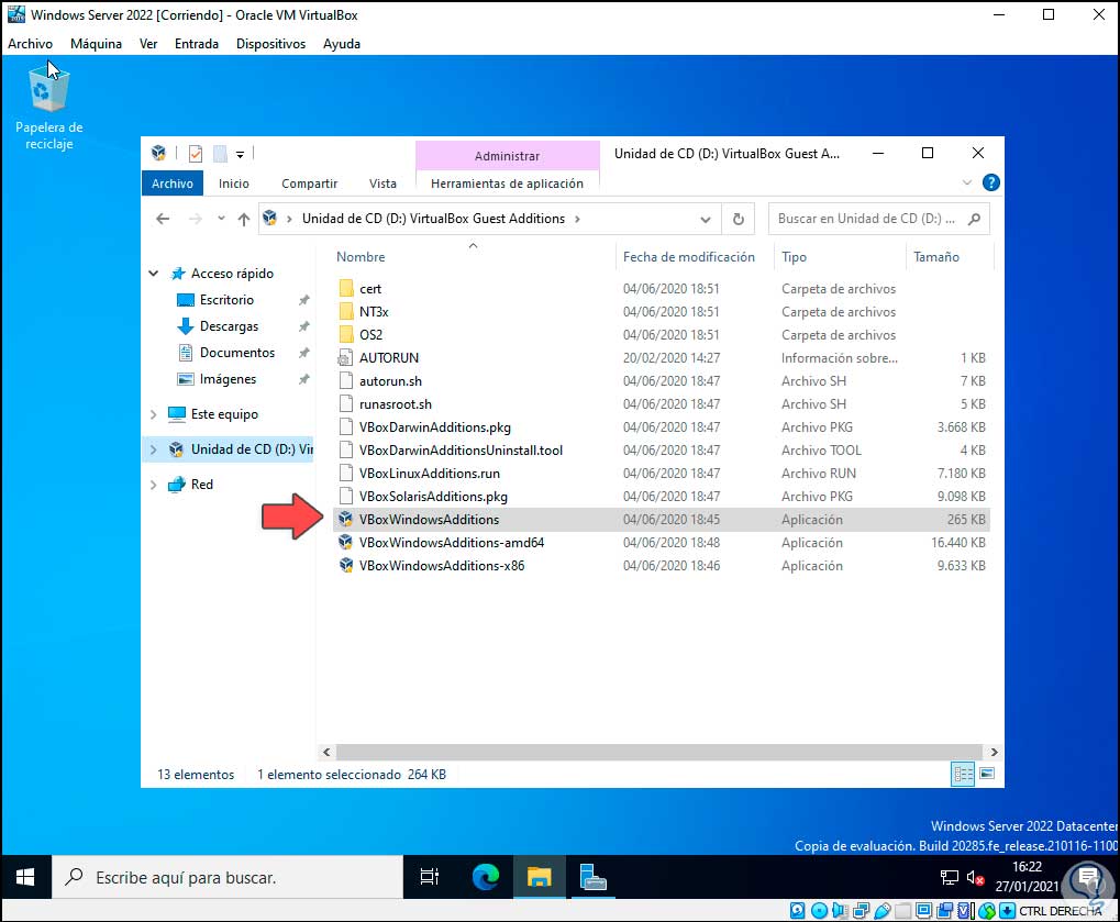 Vamos al menú "Dispositivos - Insertar imagen de CD de las Guest Additions":