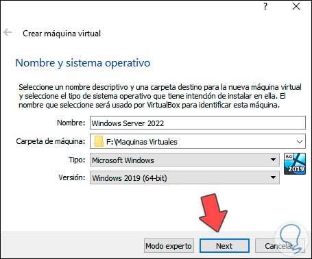 Una vez descargada la ISO, en VirtualBox ingresa el nombre de la máquina, ubicación y tipo de sistema a usar, en este caso Windows 2019 (64-bit):