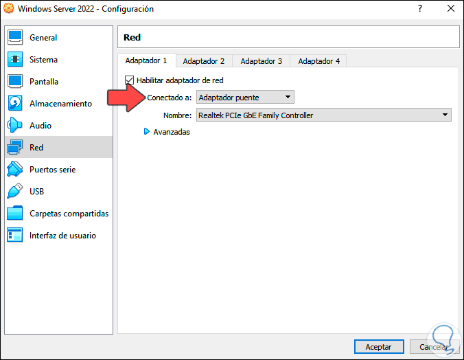Vamos a la configuración de la máquina y en la sección "Red" establecemos "Adaptador puente". Aplicamos los cambios.