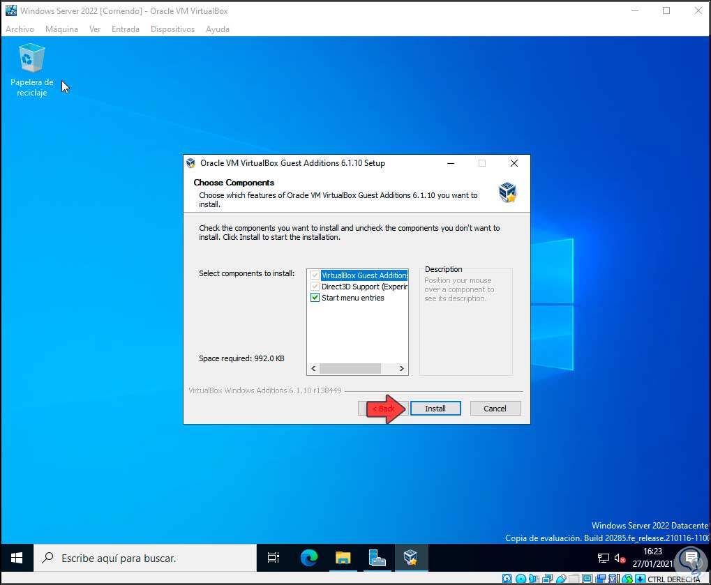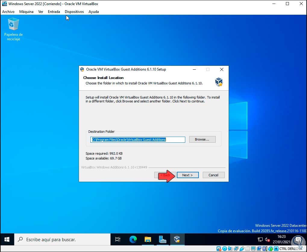Clic en Next para definir donde se instalarán estas funciones de VirtualBox: