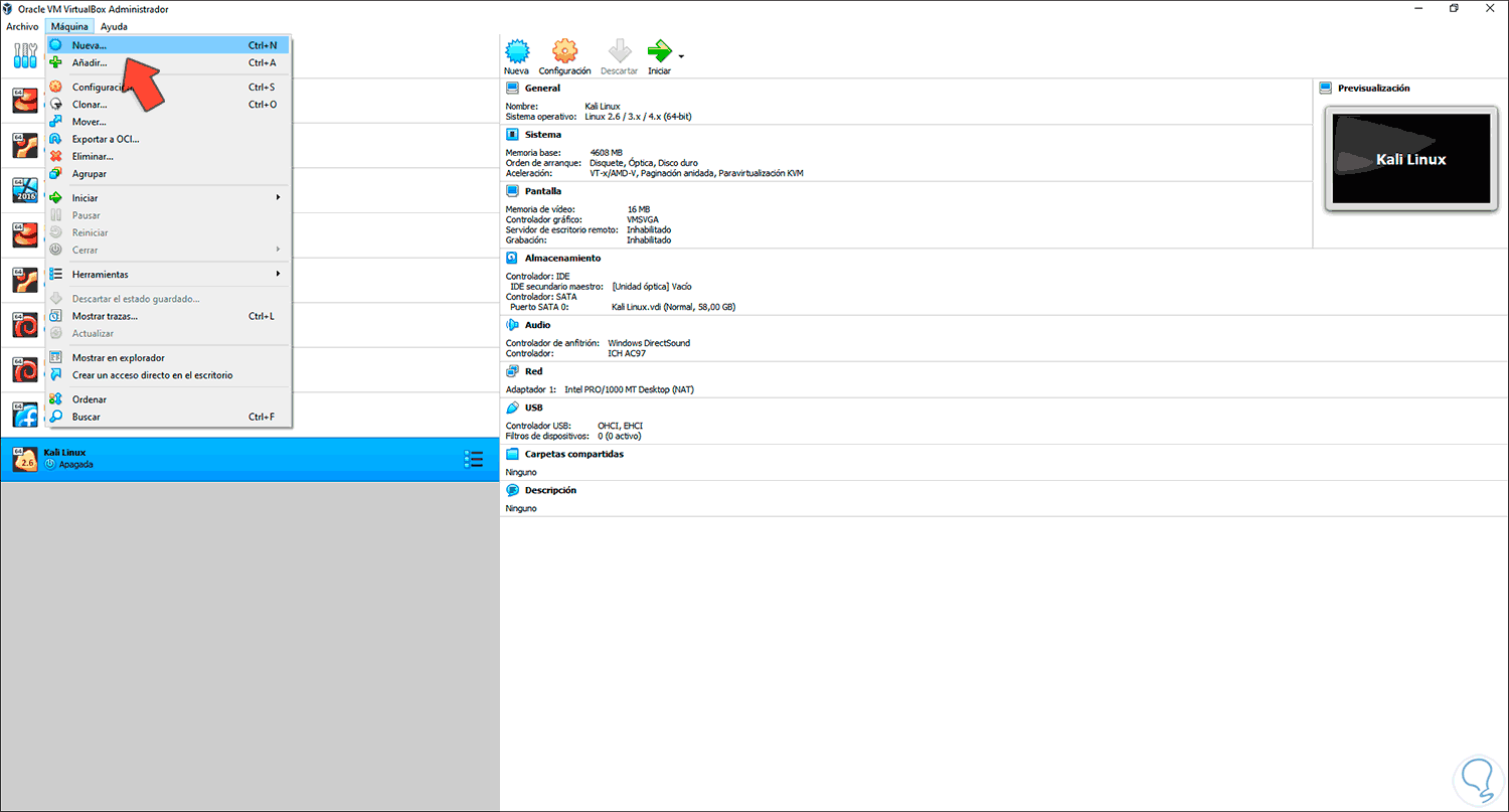 Abre VirtualBox y ve al menú "Máquina - Nueva":