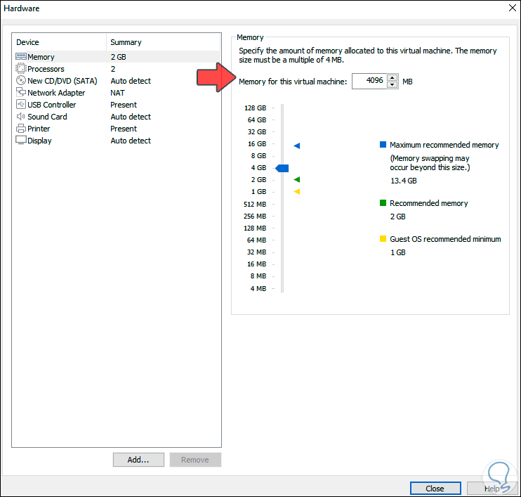 Damos clic en “Customize hardware” y en la ventana de configuración vamos a asignar la memoria RAM deseada: