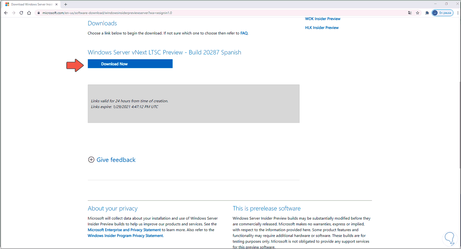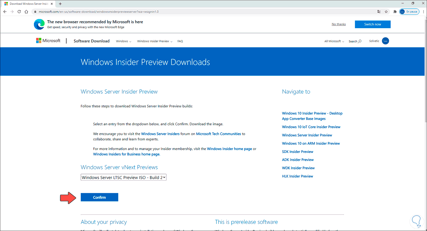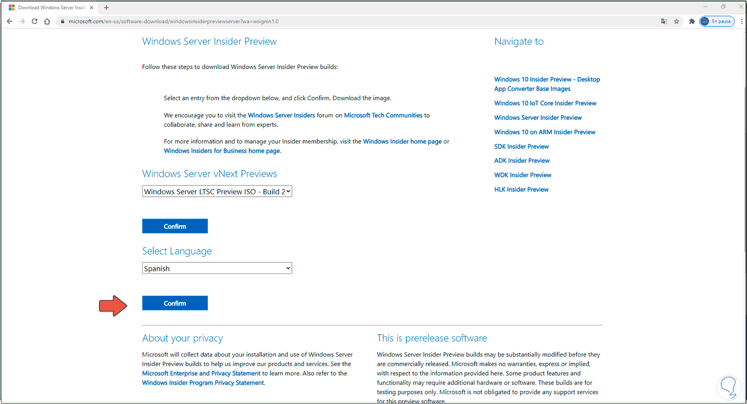 Clic en Confirm y estamos listos para descargar la ISO de Windows Server 2022: