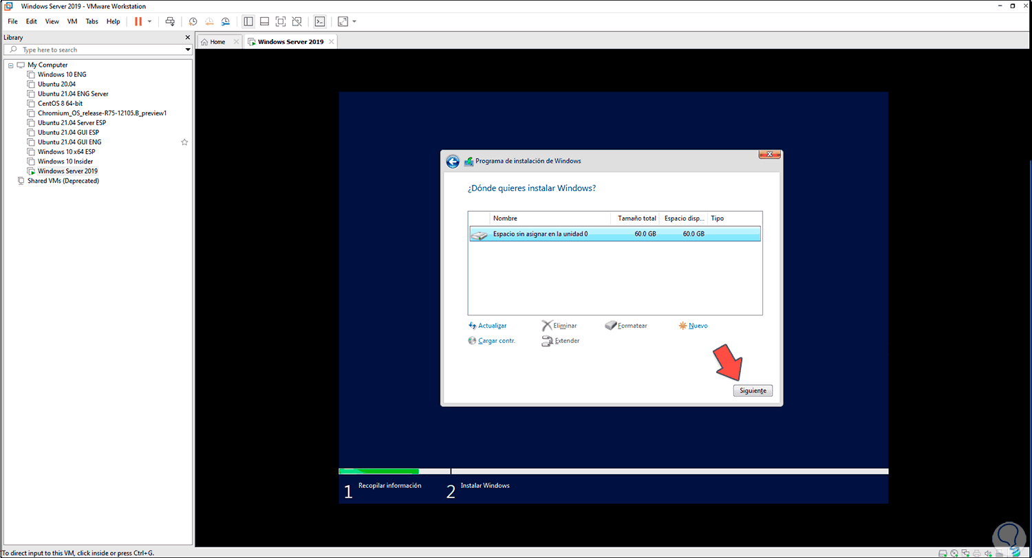 Por último, seleccionamos el disco e inicia el proceso de instalación de Windows Server 2022: