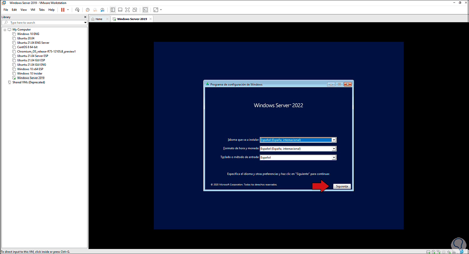 Clic en Siguiente para iniciar la instalación de Windows Server 2022: