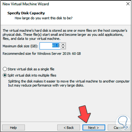 Clic en Next y vamos a definir el tamaño del disco y tipo de almacenamiento a usar: