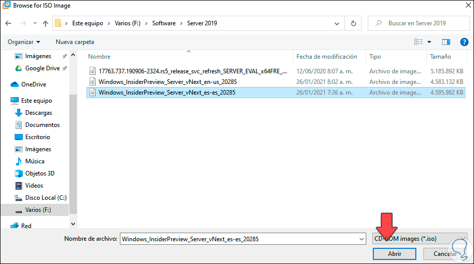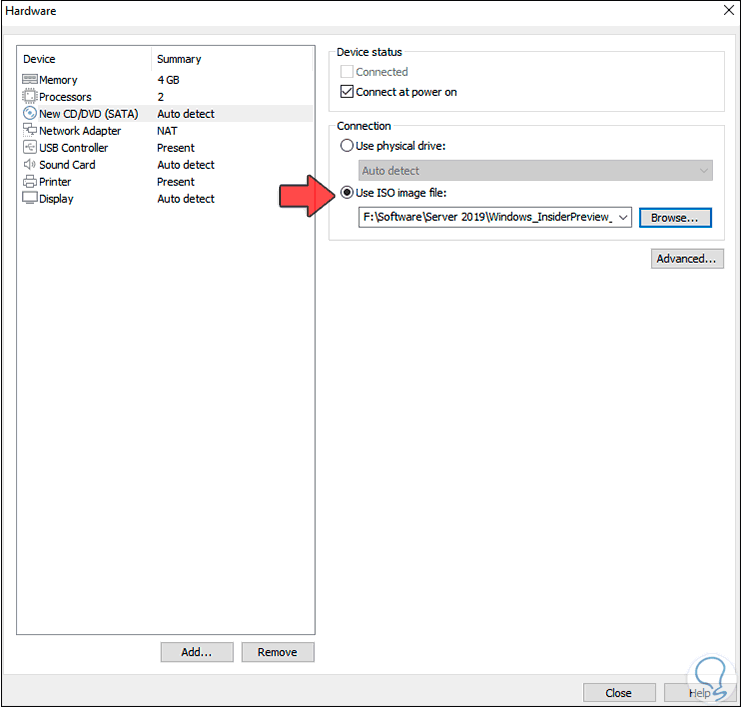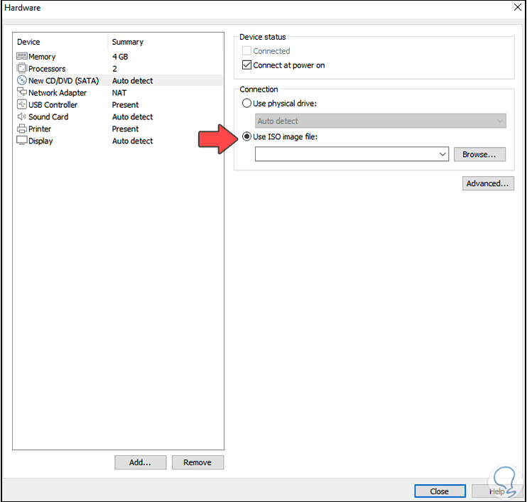Activamos la casilla “Use ISO image file”, damos clic en Browse y elegimos la ISO: