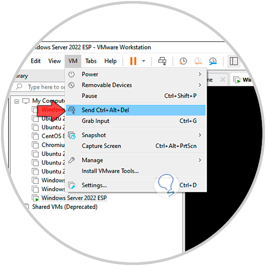 Para acceder a Windows Server 2022 vamos al menú "VM - Send Ctrl + Alt +Del":