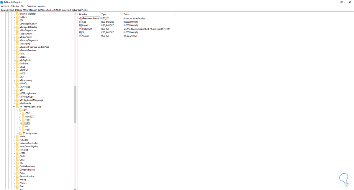 HKEY_LOCAL_MACHINE\SOFTWARE\Microsoft\NET Framework Setup\NDPEn la carpeta de la versión encontramos la versión de .NET completa: