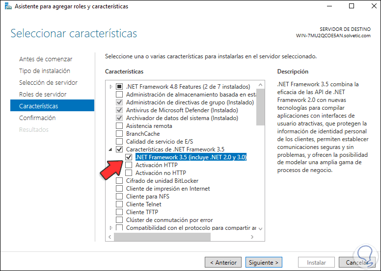 En esta sección no realizaremos ningún cambios, pasamos a la sección "Características" y allí encontramos Características de .Net Framework 3.5: