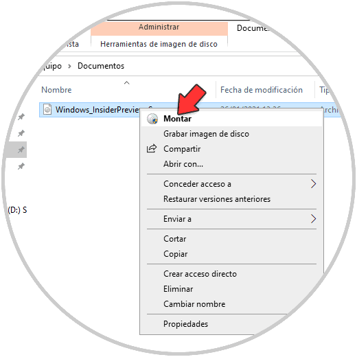 Una vez descargada en el servidor, damos clic derecho sobre la imagen ISO descargada y seleccionamos "Montar":