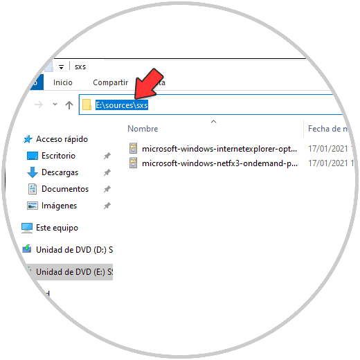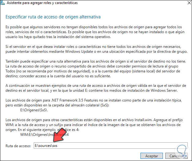 Damos clic en "Especifique una ruta de acceso de origen alternativa" y en la ventana emergente ingresamos la ruta de SXS vista anteriormente: