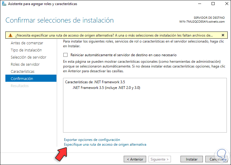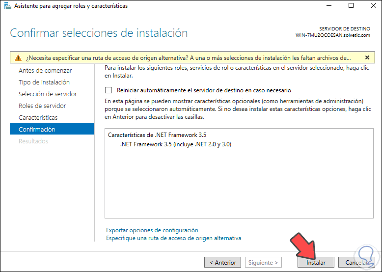 Clic en "Instalar" para completar el proceso de instalación de .NET Framework 3.5 en el servidor Windows Server 2022: