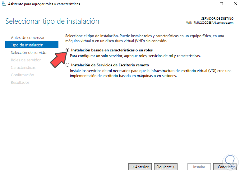Clic en Siguiente y activa la casilla "Instalación basada en características o en roles":