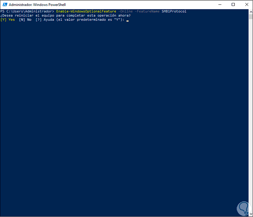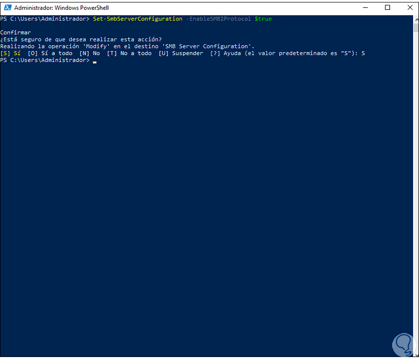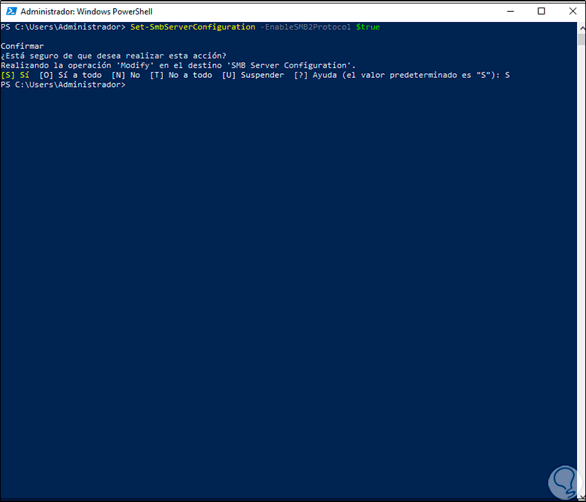 Ahora activamos SMB2 con el comando. Con la letra S confirmamos el proceso.