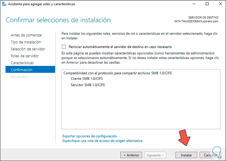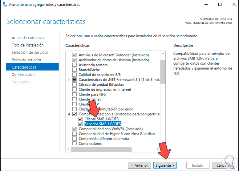 En este caso no agregamos algún rol, vamos a la sección "Características" y activamos la casilla "Compatibilidad con el protocolo para compartir archivos SMB 1.0/CIFS", desplegamos sus opciones y activamos las casillas deseadas "Cliente SMB 1.0/CIFS/ Servidor SMB 1.0/CIFS ":